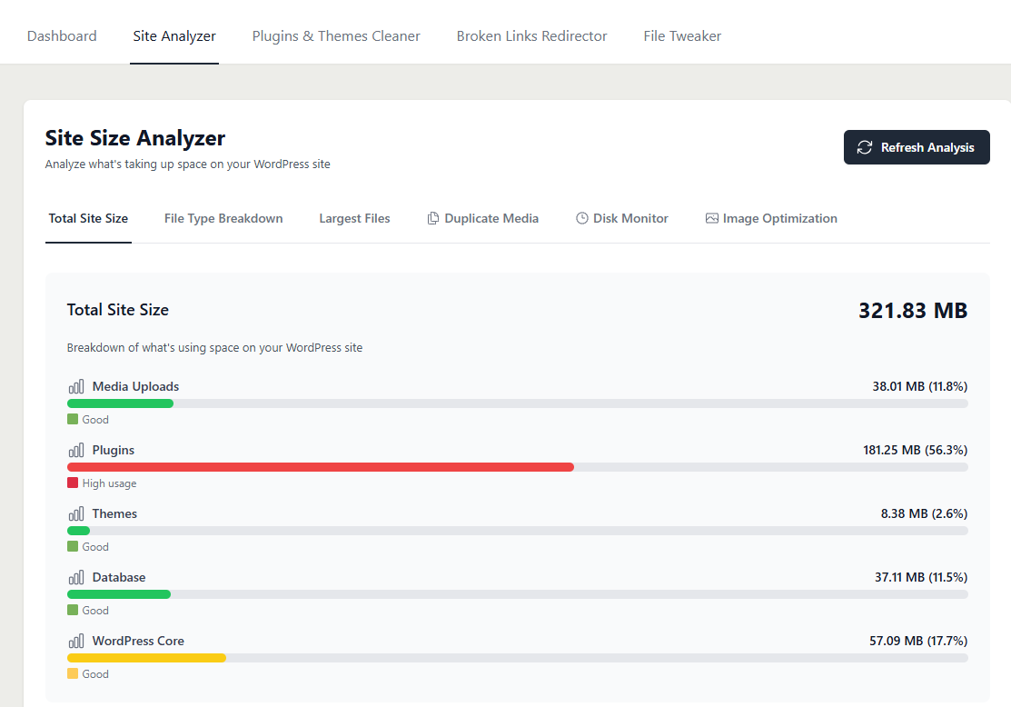 Quickly monitor disk usage, detect optimization opportunities, and maintain a healthy WordPress environment — all from a modern, easy-to-use dashboard.