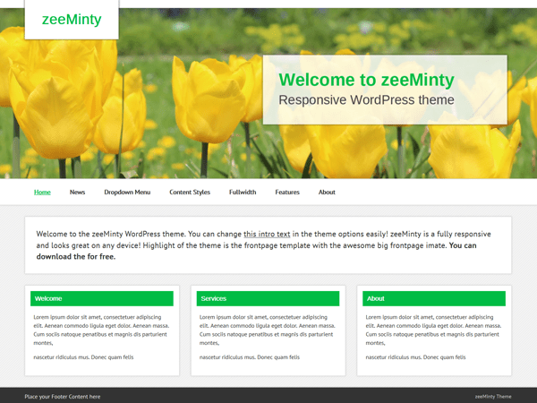 zeeMinty is a clean and light WordPress business theme with an awesome image eyecatcher on the frontpage template. Furthermore the frontpage features a horizontal widget area and an intro text which is perfectly suited for a company home page. The theme is created in modern HTML5 and CSS3 code and is fully responsive which means it looks good on any mobile device. The included theme options let you choose from nine different color schemes, left or right sidebar layout and upload your own logo image. Of course there is support of all WordPress core features like custom menus, custom background, custom header and featured images. Check out a full demo on http://preview.themezee.com/zeeminty/