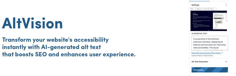 AltVision automatically generate precise alt text for your images by analyzing both the image and its surrounding context. The plugin considers headings, paragraphs, and captions near the image to create highly relevant descriptions. Stop spending hours writing manual descriptions – let AI do the heavy lifting!