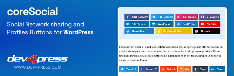 coreSocial plugin implements two major features in one plugin: sharing posts or pages on social networks, and linking social networks and website profiles. coreSocial includes blocks for use in the Block Editor for adding share posts and list of profiles with wide range of options for styling.