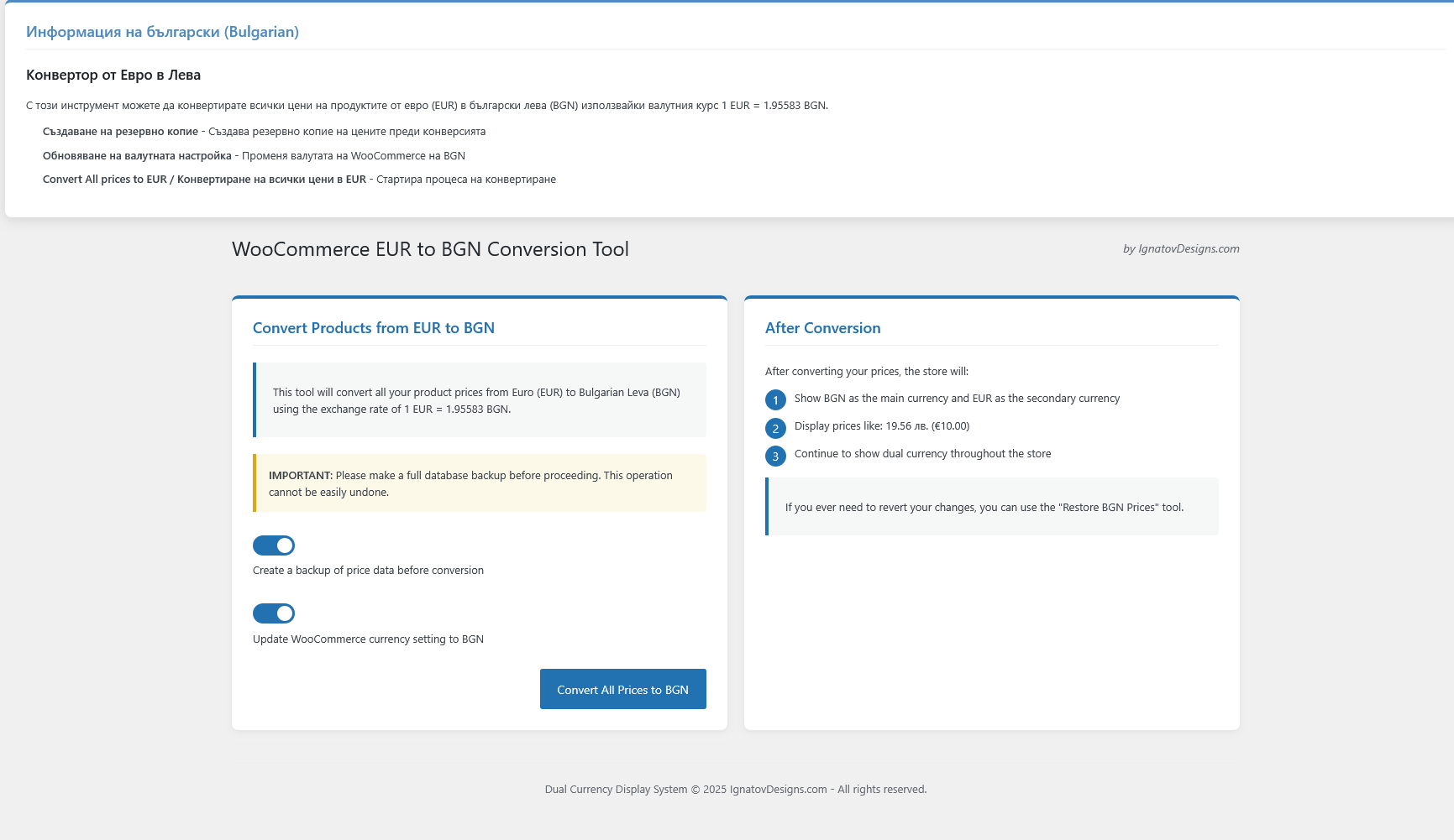 Dual Currency Display for WooCommerce provides a seamless way to display prices in both Bulgarian Leva (BGN) and Euro (EUR) throughout your WooCommerce store. Perfect for Bulgarian businesses selling internationally or preparing for Euro adoption.