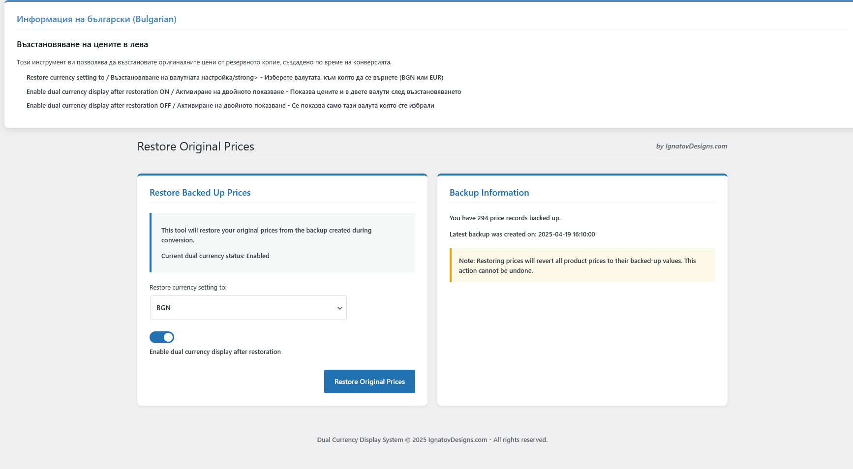 - Dual Currency Display – Show prices in both BGN and EUR throughout your store