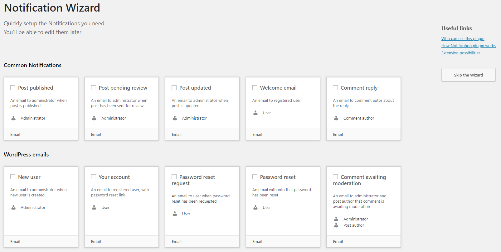 Now, with this plugin, you can easily disable default WordPress emails and replace them with your own. To do that you can use our awesome Wizard which will guide you through the process.