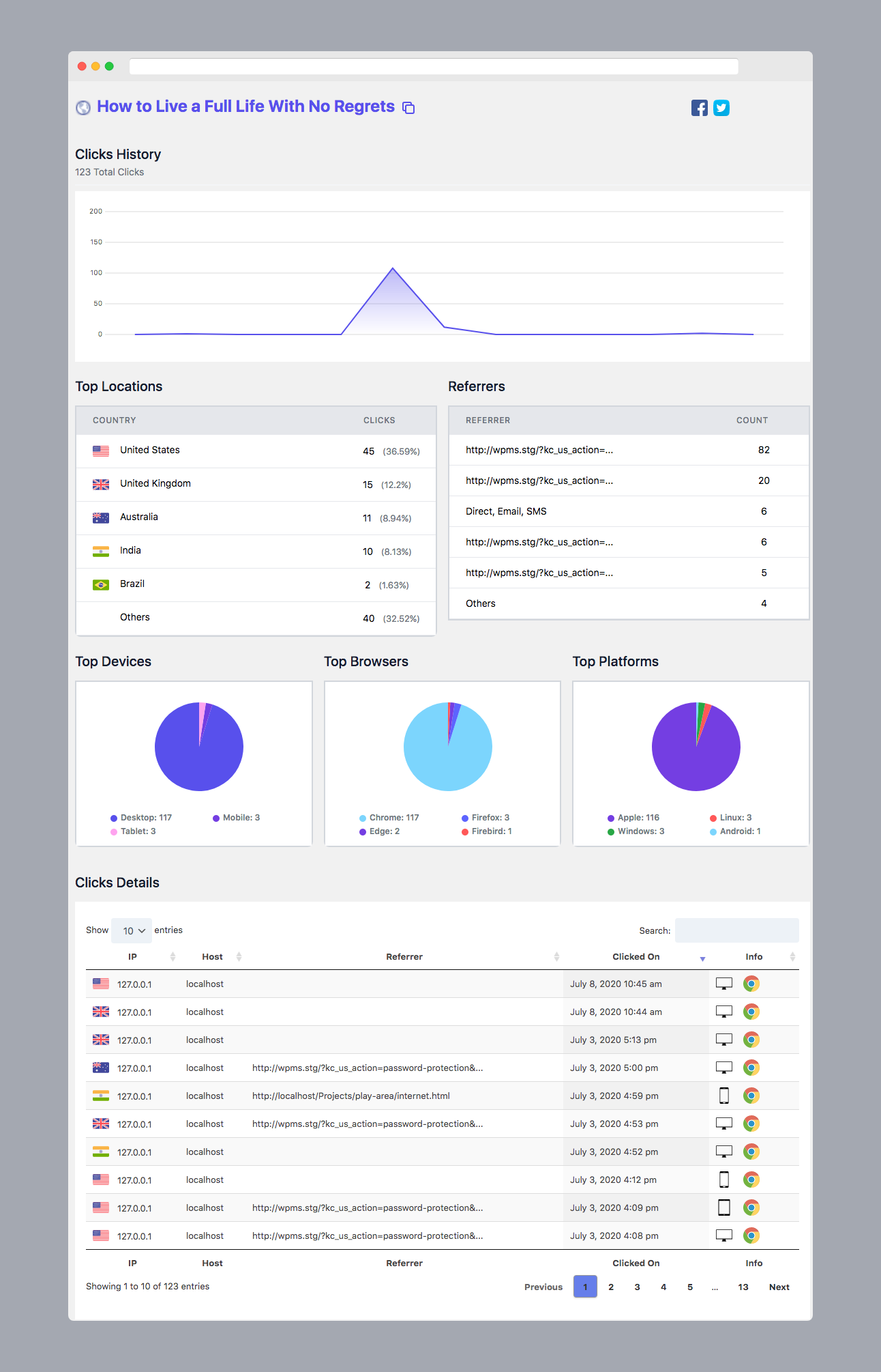 Full analytics for individual links and link groups, including geo 🇺🇸 🇬🇧 🇦🇺 🇫🇷 🇮🇳 🇩🇪 and device information, referrers, browser, IP, and more.👉 Automatically Create Short Links For Posts & Pages