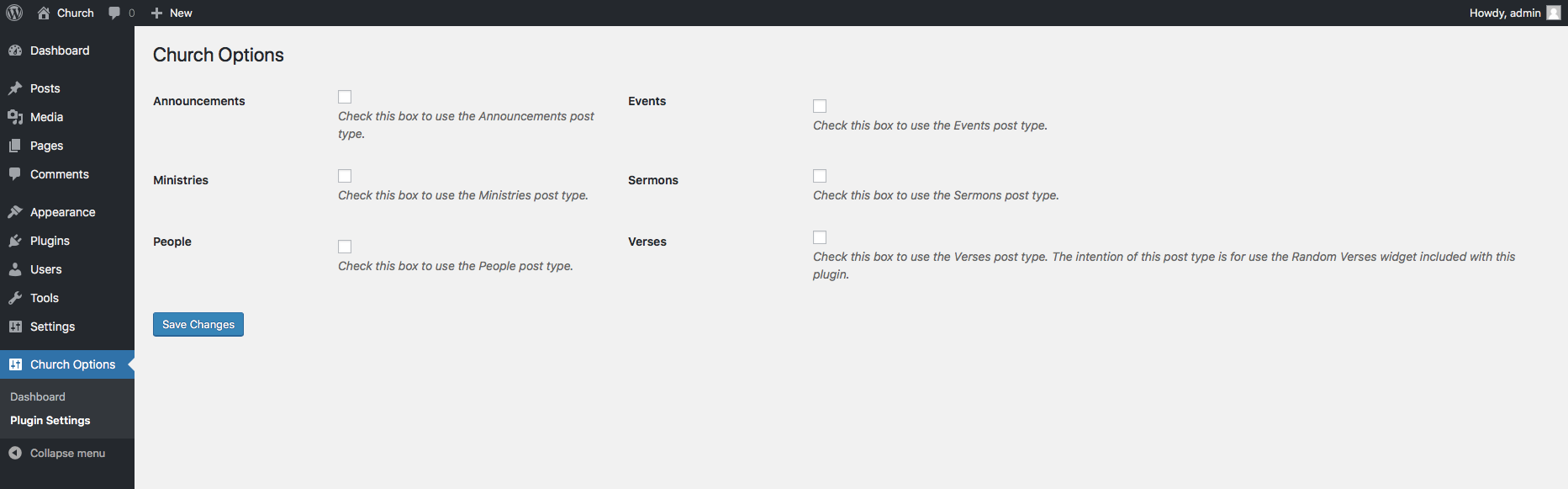 - Click on Church Options->Settings to choose the post types you wish to use