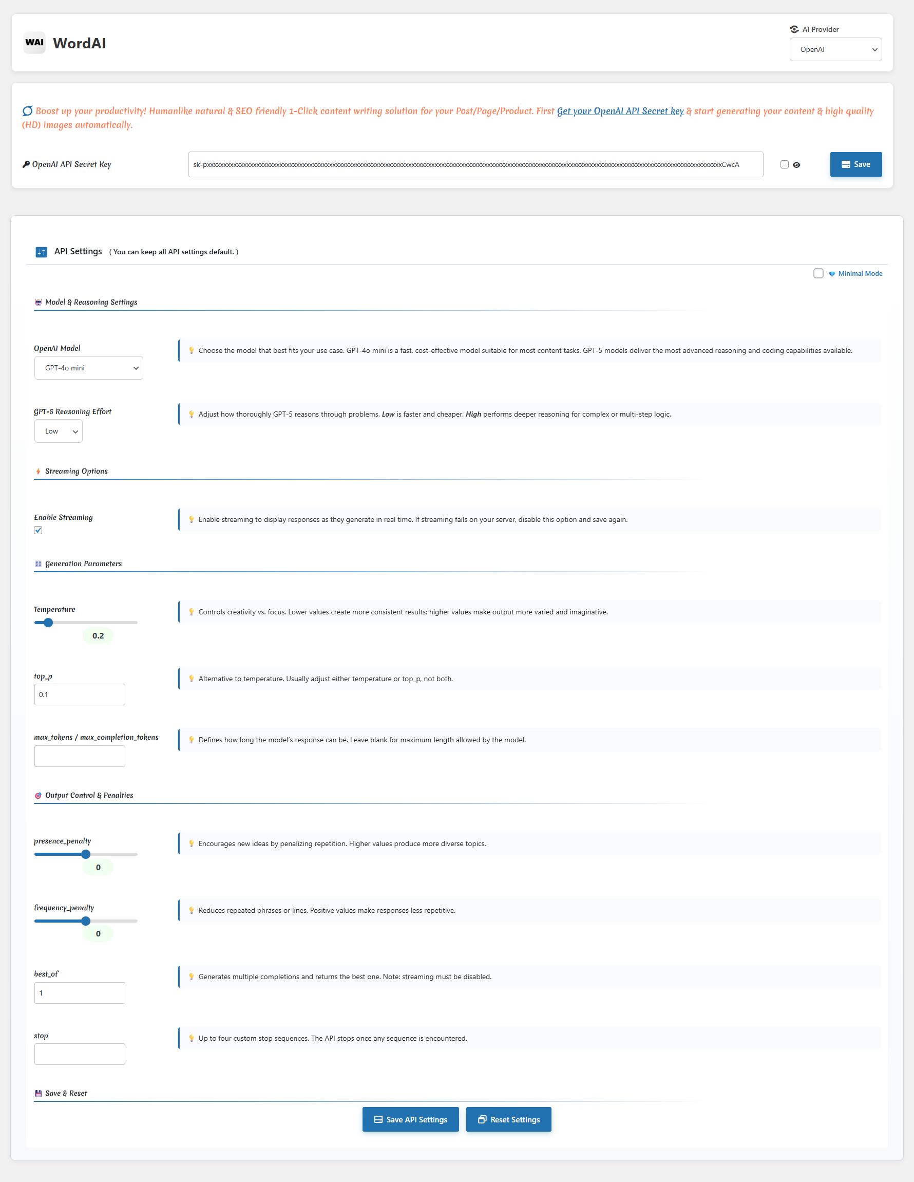 WordAI supports the latest OpenAI and Google Gemini models available in your account. Choose your preferred model in API Settings.