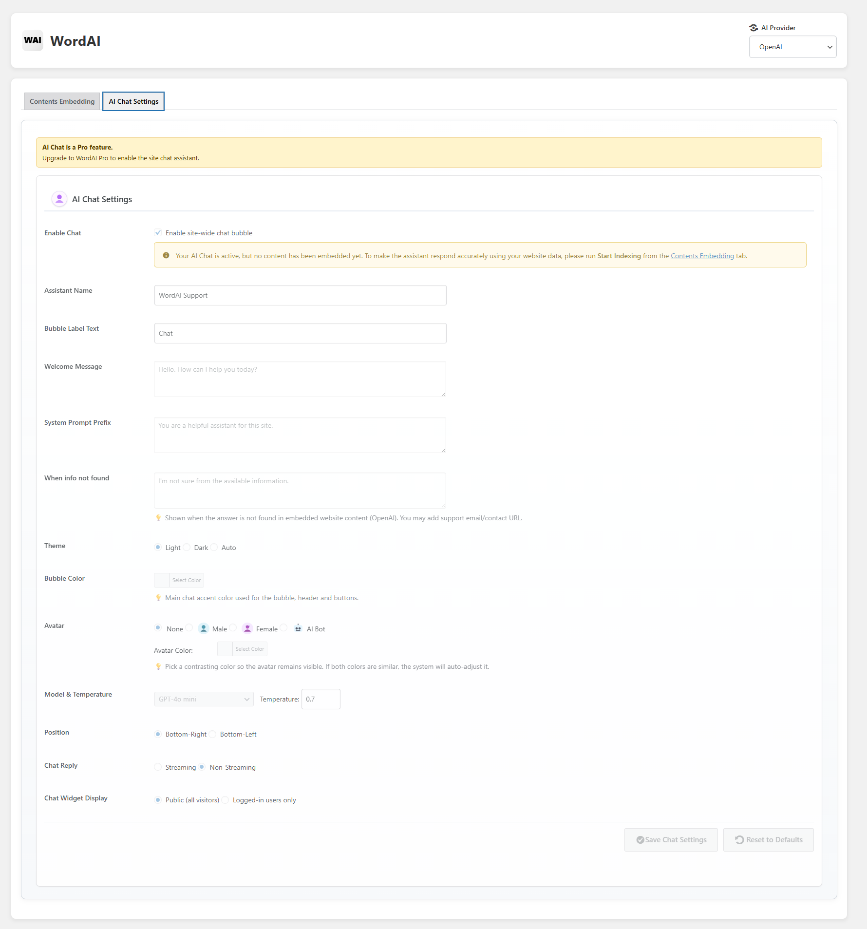 WordAI AI Agent page (AI Chat Settings tab) shown in Free version with Pro feature preview