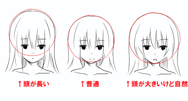 これを避けたいのなら、顔の比率の通りに描いたり、アゴのラインと頭のラインを見比べるなどをするようにしましょう。頭のラインからできる縁と、アゴのラインが離れすぎていると、頭部のバランスが崩れてきている証拠、逆にこれが合っていれば多少頭を大きくしても平気になります。