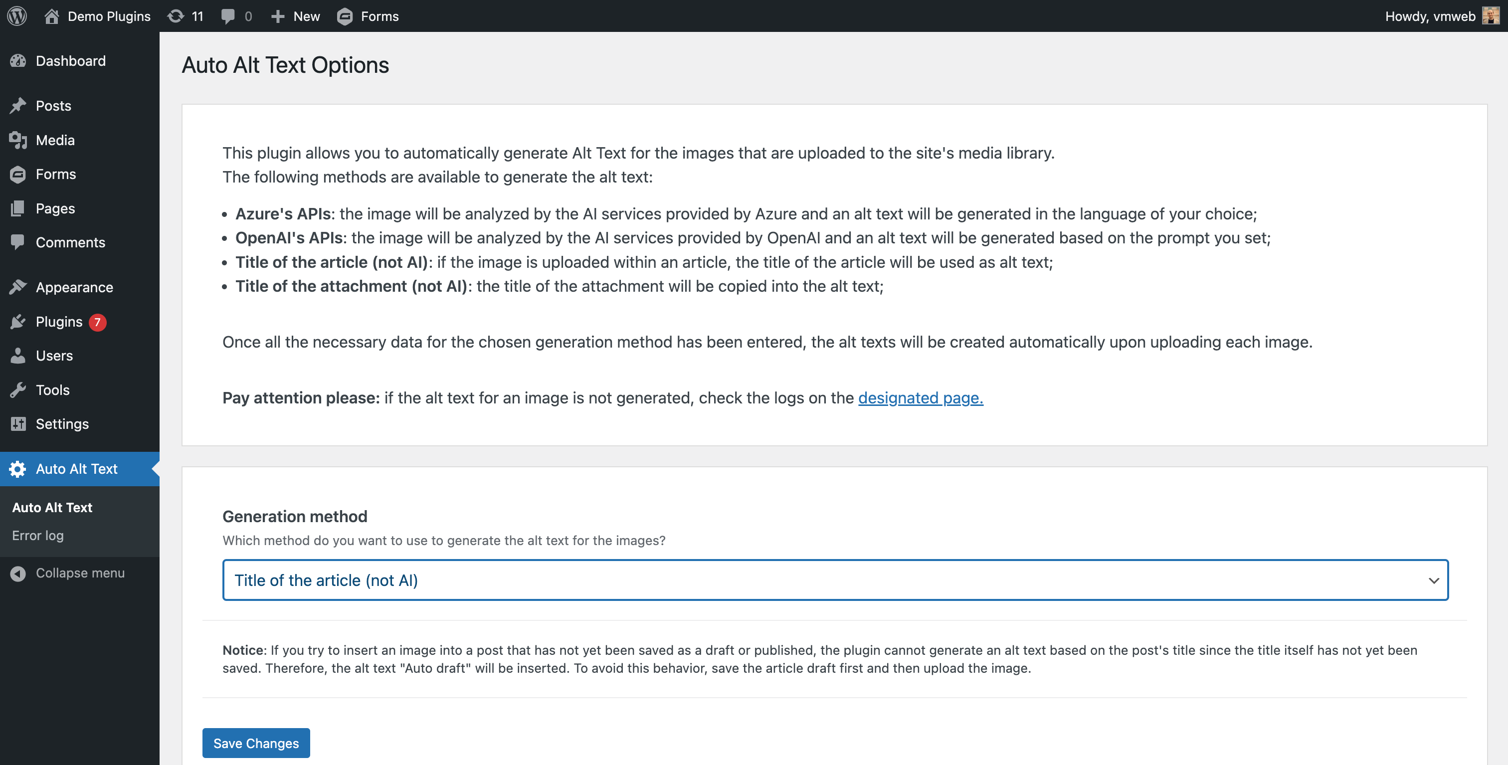 Once the plugin is configured, each time an image is uploaded to the media library, an alt text will be automatically set based on the selected generation method.