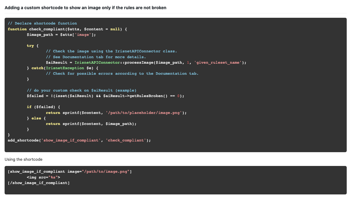 The Example Usage tab gives you some examples on how to integrate the AI prediction to your WordPress site. Choose the one that best fits your case and then go from there.