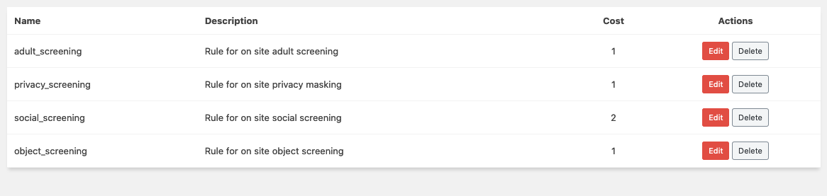 Once saved, you are redirected to the list of all rules with name, description and cost (learn more about cost here). From here you can also Edit or Delete the listed rules.