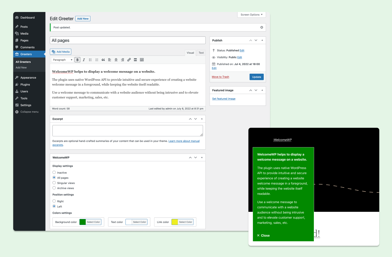 The plugin uses native WordPress API to provide intuitive and secure experience of creating a website welcome message in a foreground, while keeping the website itself readable.