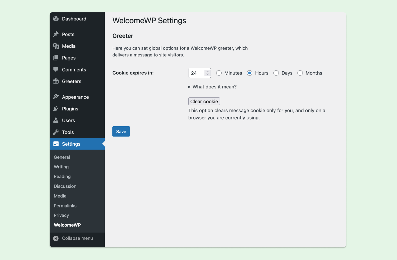 After installing and activating the plugin, Greeters link is added to sidebar in dashboard.