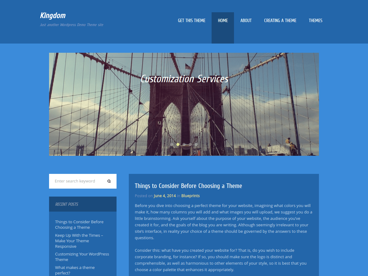 Looking for a balanced yet highly flexible theme for your website? If so, let us introduce a breathtaking solution! Kingdom is a unique theme that can easily bring your website to perfection. Neat, dainty and extremely easy to use, this theme will truly make your website stand out. Also, you can rest assured that your site’s purpose will not be overshadowed by the abundance of little details – with Kingdom, you receive a simplistic, yet utterly functional wrap for your ideas. Although there is no limit to the fields this theme can be applied to, we believe it is best suited for Construction, Daily news, Cultural overviews, Fashion magazines, Sports reviews, Distribution sevices, Storage services, Network companies, Travel agencies, Workshops, Travel advice, Travel reviews. The demo version of this theme can be found here: http://wp-demo-theme.bestweblayout.com/kingdom/