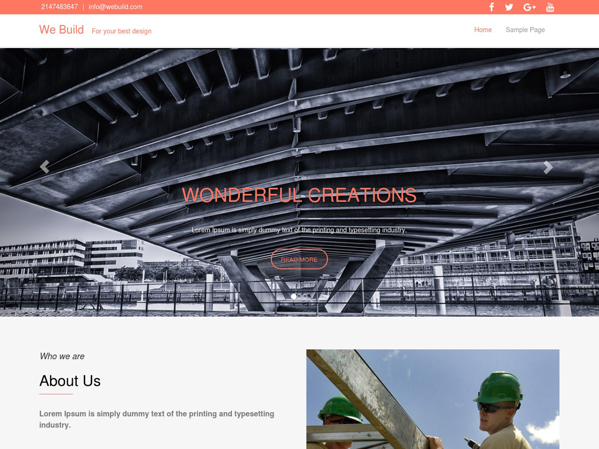 We Build is a responsive and beautifully crafted premium like free WordPress theme which can be used for any of your purpose like corporate, restaurent, personal blog, start-up, food, travel, lawyer and attorney, writer, blogger,etc. This theme is fully responsive and works well in all screen size devices. Customizer options are easy to handle and can be used to create any kind of beautiful website. This is truely a premium kind of theme with a great and suitable layout for any kind of business. It features infinite scroll, great blog section and social media icons to link your social media profile and very SEO friendly so you can boost traffic to your website with this theme.You can find a perfect demo at astaporthemes.com/demo/we-build.
