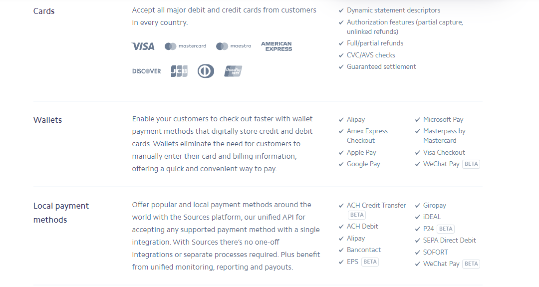 If you want more payment methods for your website, you can definitely choose Stripe as it offers a wide range of options. With Stripe, you can accept major debit cards and credit cards. And, you can also accept payments through digital wallets such as Apple Pay, Google Pay, etc.
