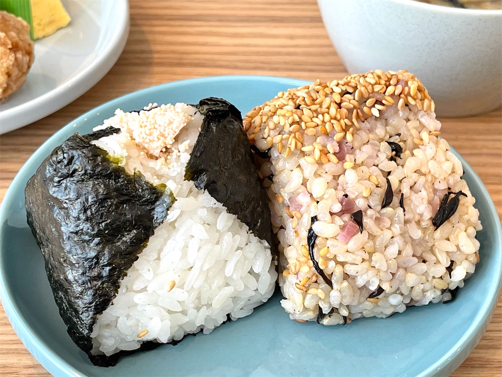 お味噌汁や卵焼き、きんぴらごぼう、唐揚げ、お漬物など、おにぎりに合うおかずも並んでいたので、卵焼きと唐揚げ、お味噌汁をつけました。