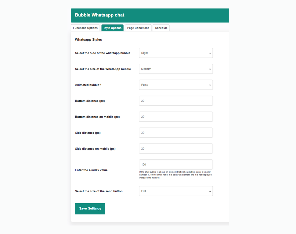 • Page Conditions – Settings to control where the WhatsApp bubble is visible on the site, including WooCommerce-specific page visibility options.