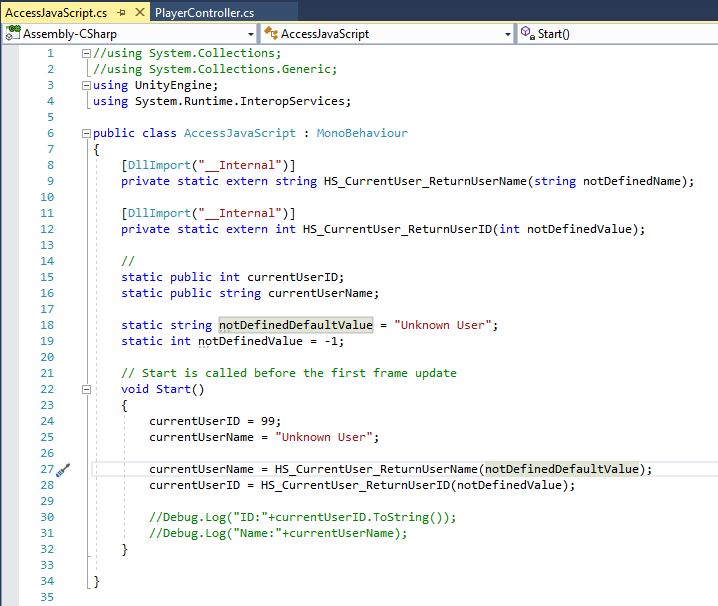 A: A short code has been added to place the logged in User ID and User Name in javascript variables. This information can then be accessed from the Unity3D game.