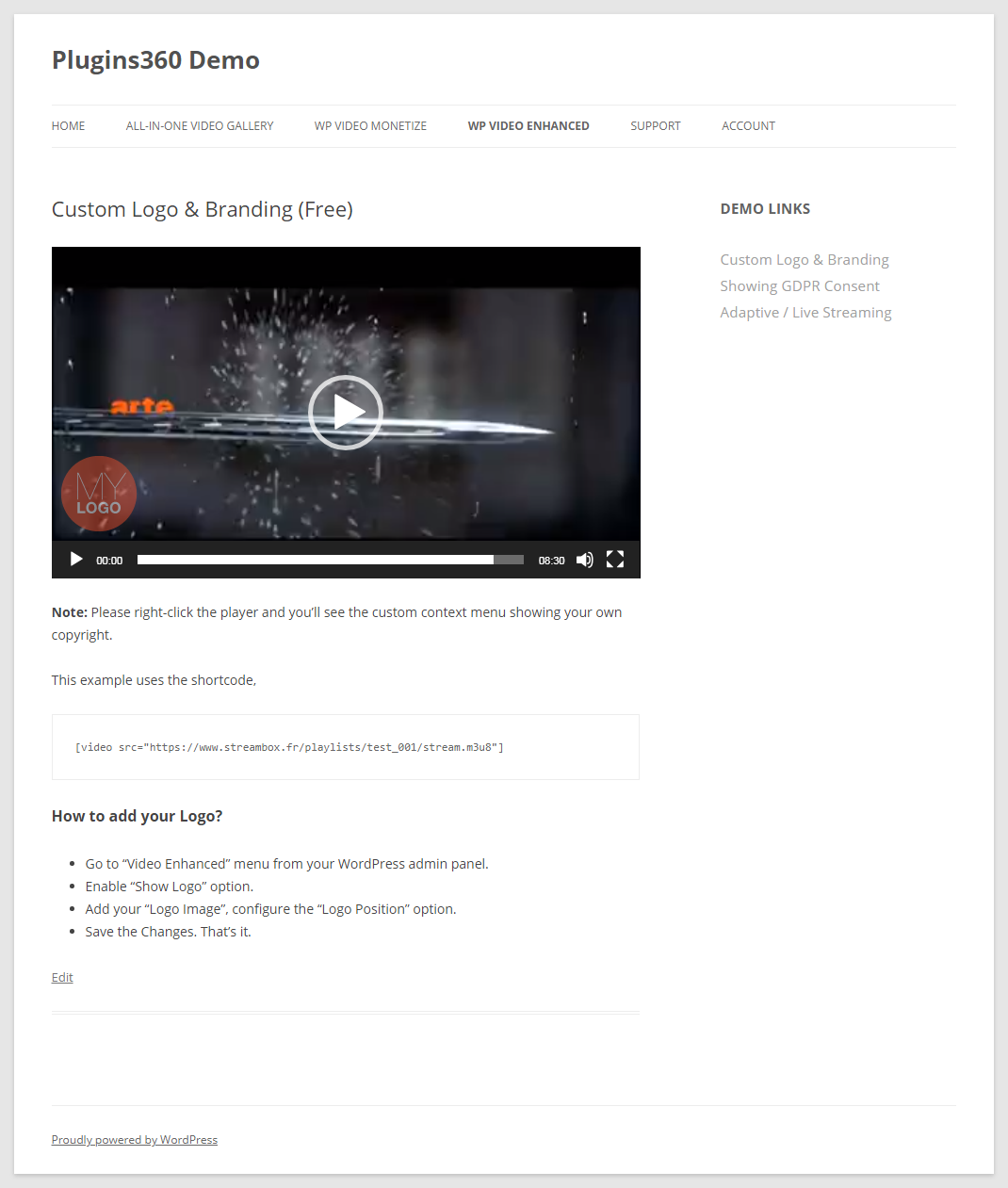 Extending Native WordPress Player with New Features. Logo & Branding, GDPR Consent, HLS, M(PEG)-DASH, Live Streaming, Configure Initial Volume and lot more.