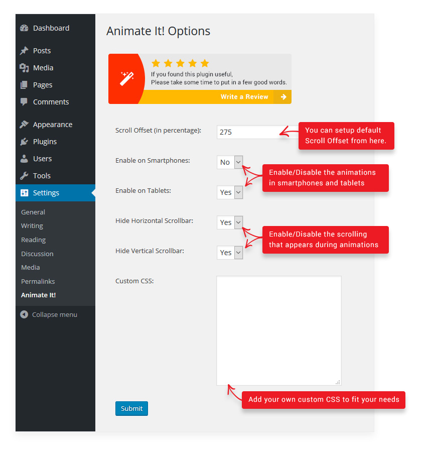 Settings – Options for Animate It! under Settings-> Animate It! menu in the admin area.