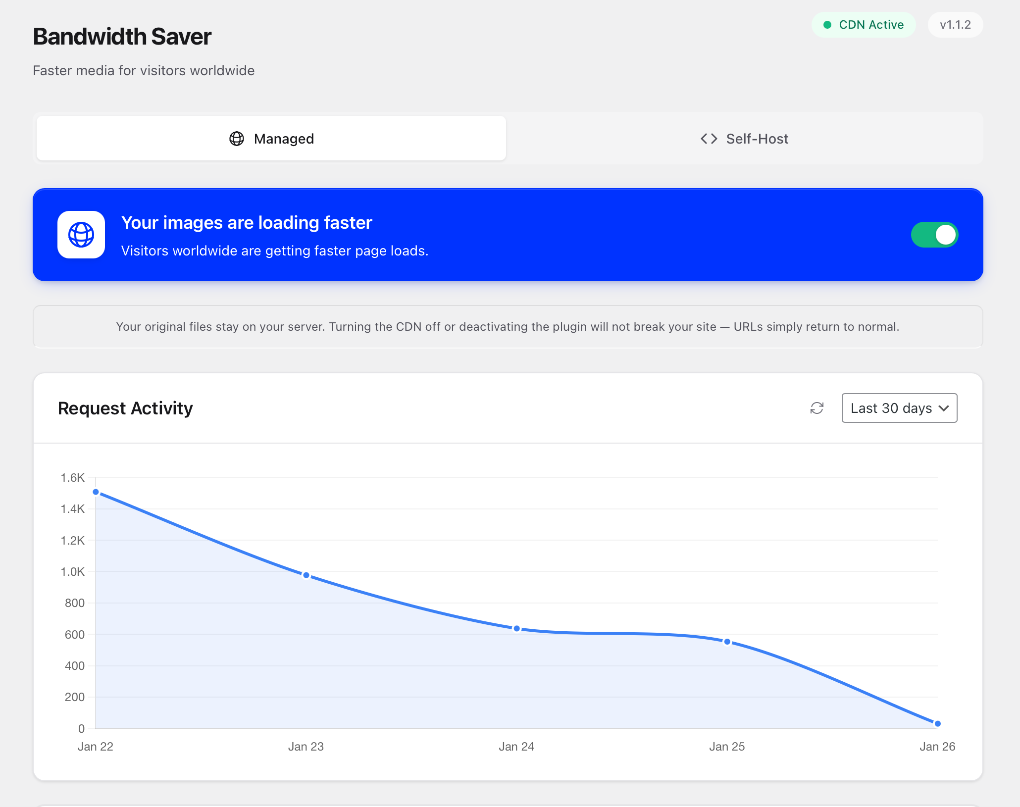 The image CDN cannot break your site. Your original files stay on your server completely untouched. The plugin only changes URLs on your public pages. If the CDN ever has issues, your site automatically falls back to loading images directly. Deactivate the plugin and everything returns to normal instantly.
