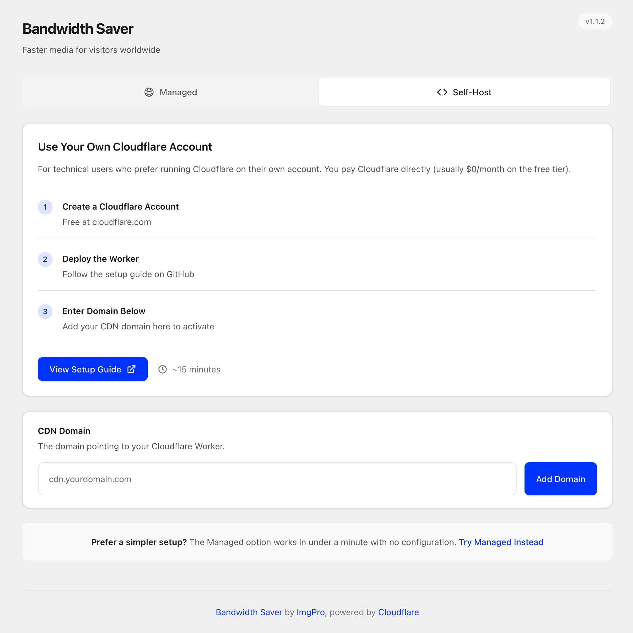 For developers who want full control, you can deploy the open-source worker on your own Cloudflare account. Your images, your infrastructure, zero external dependencies.