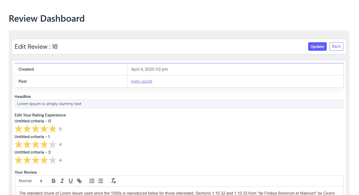 - Single Review edit view [cbmscratingreview_editreview]