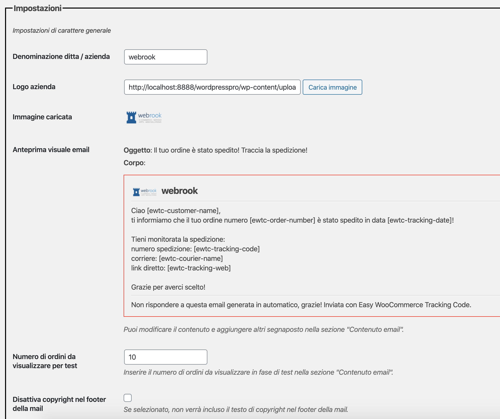 Oltre all’inserimento del numero di tracking code, sono disponibili tante altre funzionalità: invio di email autenticate via SMTP per evitare che finiscano nello spam, possibilità di personalizzare la mail da inviare al cliente inserendo dei comodi segnaposto che verranno sostituiti in fase di invio, possibilità di testare la mail che il cliente dovrebbe ricevere direttamente sulla propria mail in anteprima.