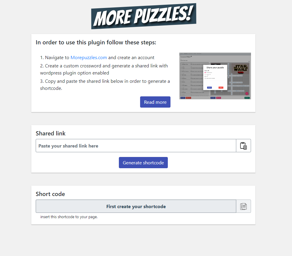 - Generate a shortcode by using puzzle shared link and paste the sortcode to your page