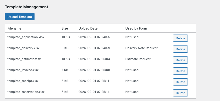 POST /templates/upload-url) — When the administrator uploads an Excel template from the plugin settings page, a pre-signed upload URL is requested. The template file name and size are sent. - PDF generation (
