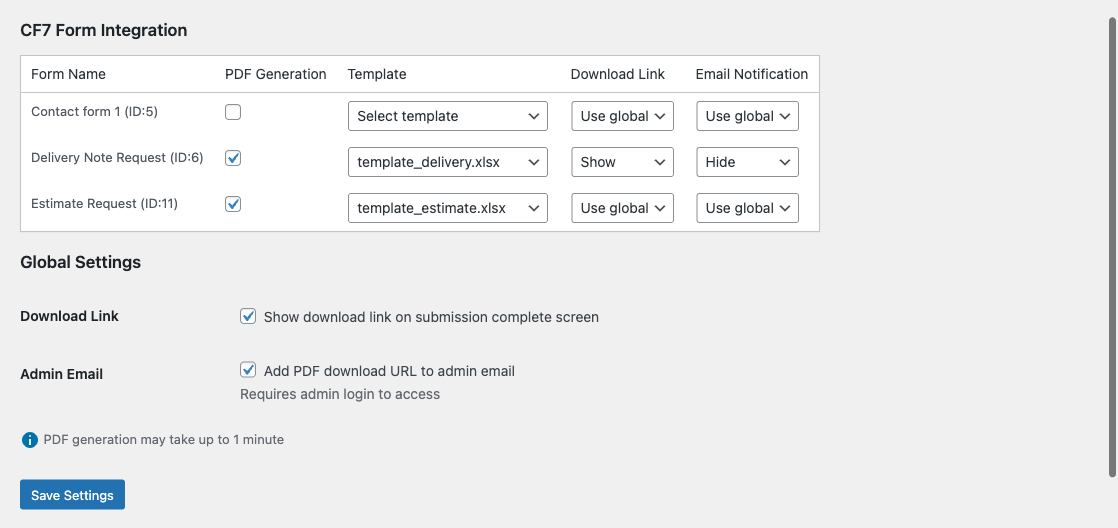 POST /convert) — When a visitor submits a Contact Form 7 form (or a WooCommerce order is completed), the form field values and template key are sent to generate a PDF. - Job polling (