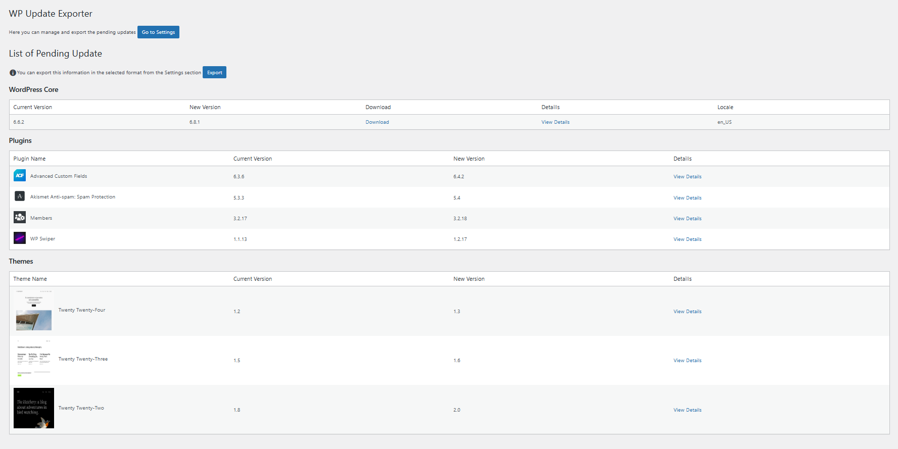 - List all pending updates for WordPress core, plugins, and themes.