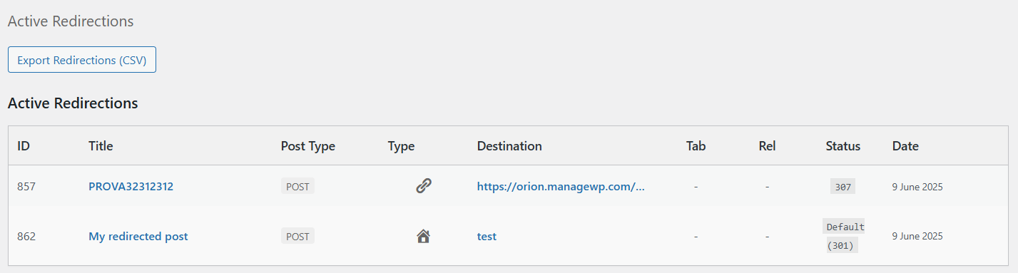 - Added “Active Redirections” table and CSV export