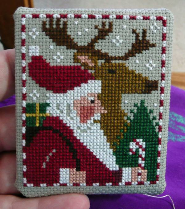 I then take my needle directly opposite where I just came out of the backing fabric and slip my needle into the linen and follow the seam along for about 3mm and bring the needle back out again.