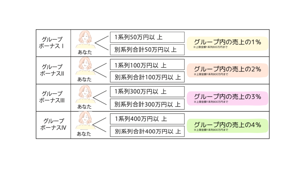 また、別途特別ボーナスというボーナスもあります。特別ボーナスは、組織の流通拡大に努力され、自身のグループ人数が100人以上となり、その後も流通組織 の安定にご尽力いただいている会員皆様にお支払いするボーナス(報奨金)です。(別途本社と契約が必要です)