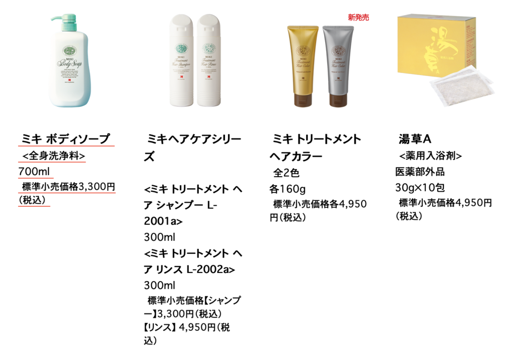 取扱製品は、ミキプルーンに代表される栄養補助食品、化粧品などのビューティーケア、シャンプーなどのパーソナルケア、洗剤の家庭用品の4つのカテゴリから成り立っています。
