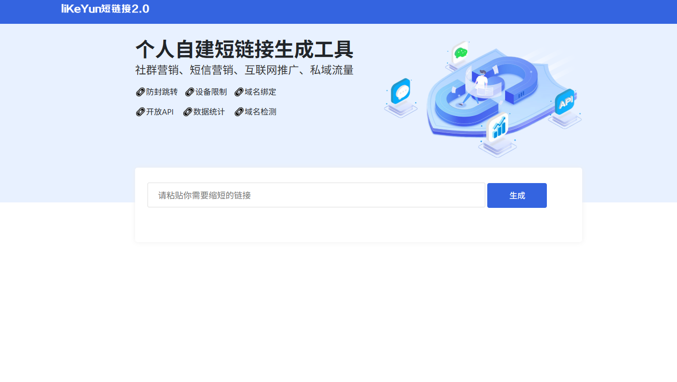 这是一套开源、免费、自建的短链接生成程序,可以通过本套程序快速自建属于自己的短链接生成平台,有丰富的功能和便捷的API,可以帮助你进行各项推广任务!