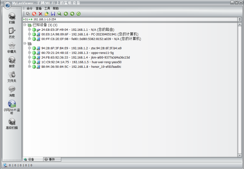 IP扫描:快速扫描局域网内的所有设备,显示设备的IP地址、主机名、MAC地址等信息。