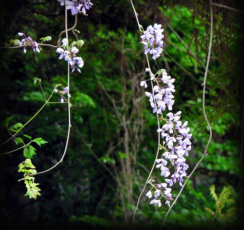 ちょっと山道に入ってみた。ふじの花が頭上近くに垂れている。いまを盛りに咲き乱れるツツジなど