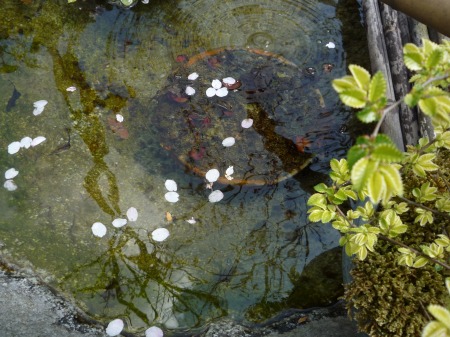 土手のサクラの花びらが南風に乗って、生垣を越えて庭まで舞い込んでくる。庭のちっぽけな石の池に