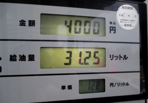 ガソリンの価格が下がったね。セルフで128円/Lとはありがたい。4千円で31.25L。