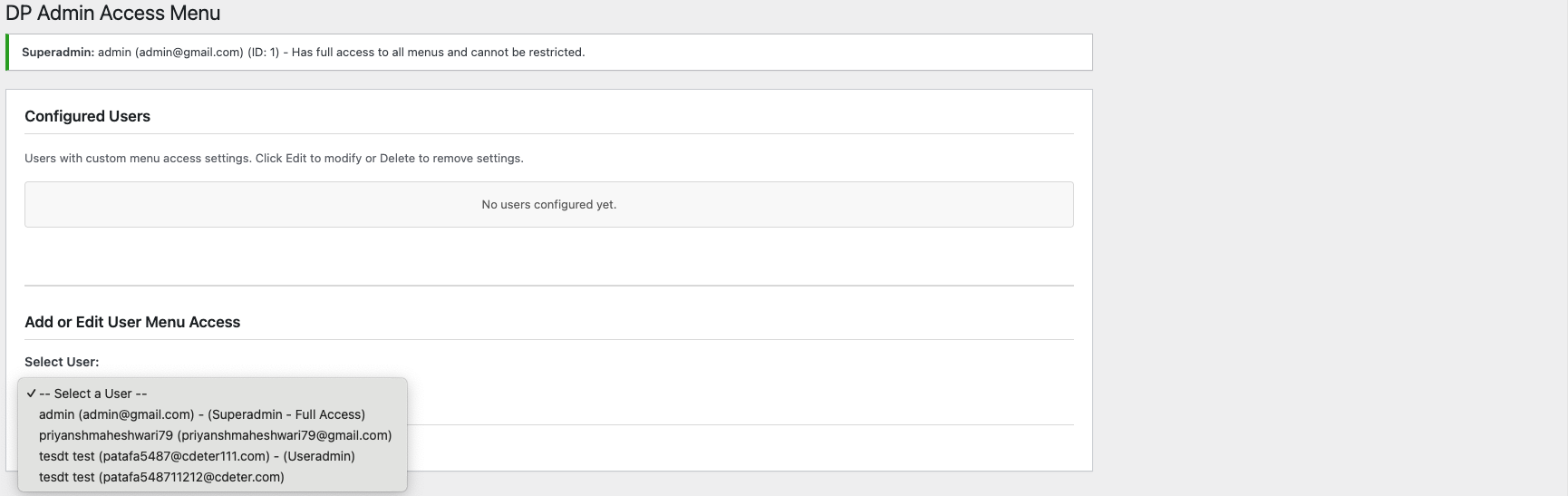 - Superadmin: The first administrator user (lowest user ID) always has full access to all menus and cannot be restricted. This ensures you never lock yourself out of your WordPress admin.