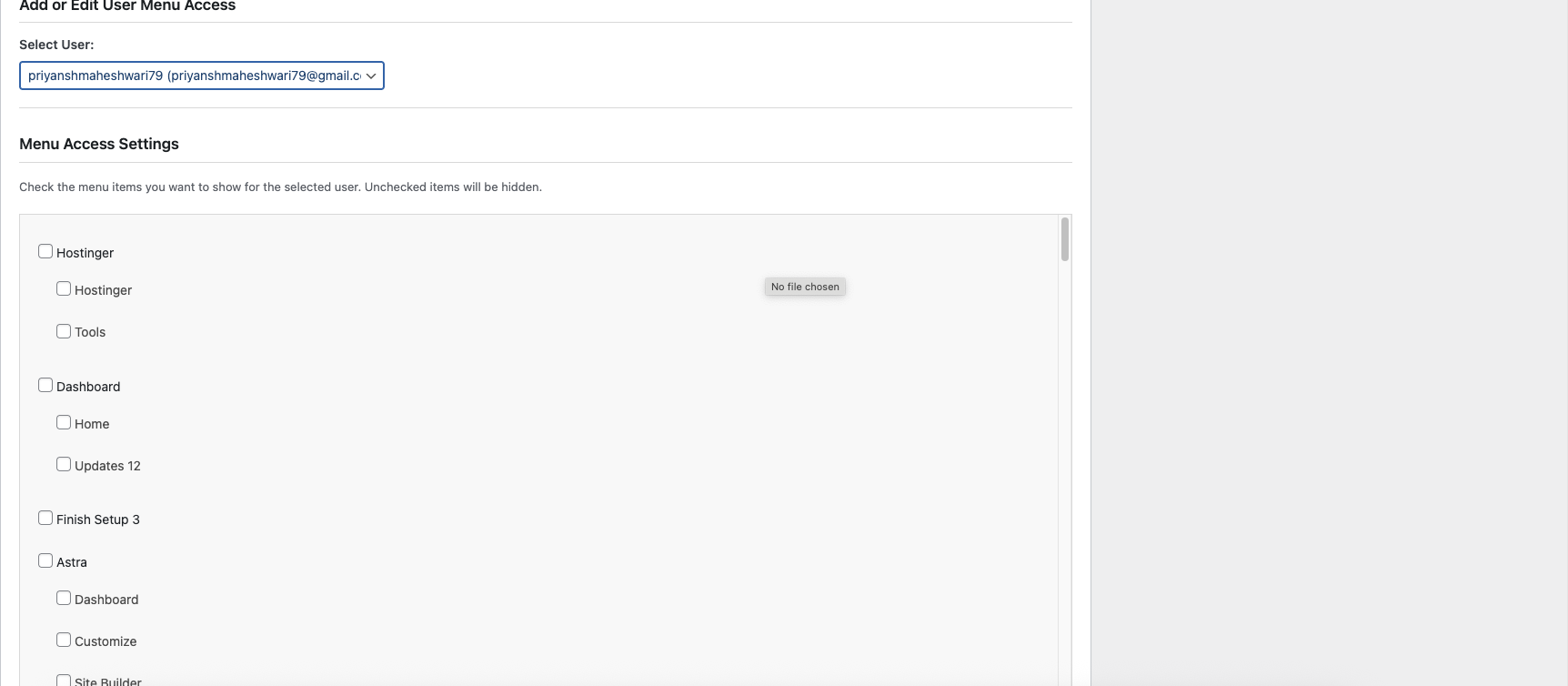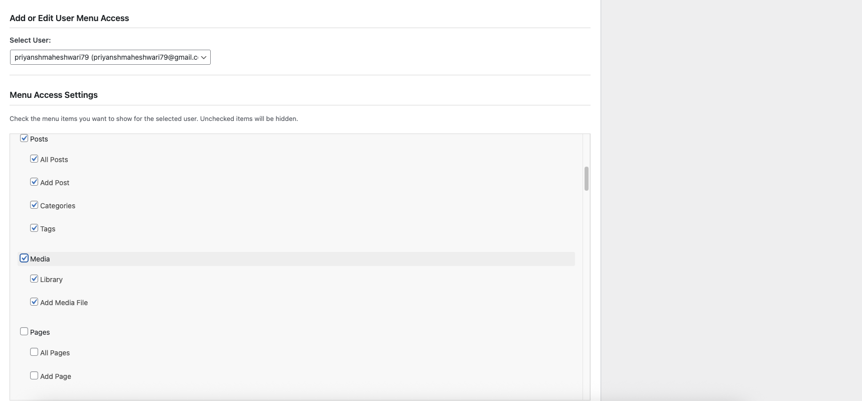 - Menu Control: Checkbox interface for all WordPress admin menu items including child menus