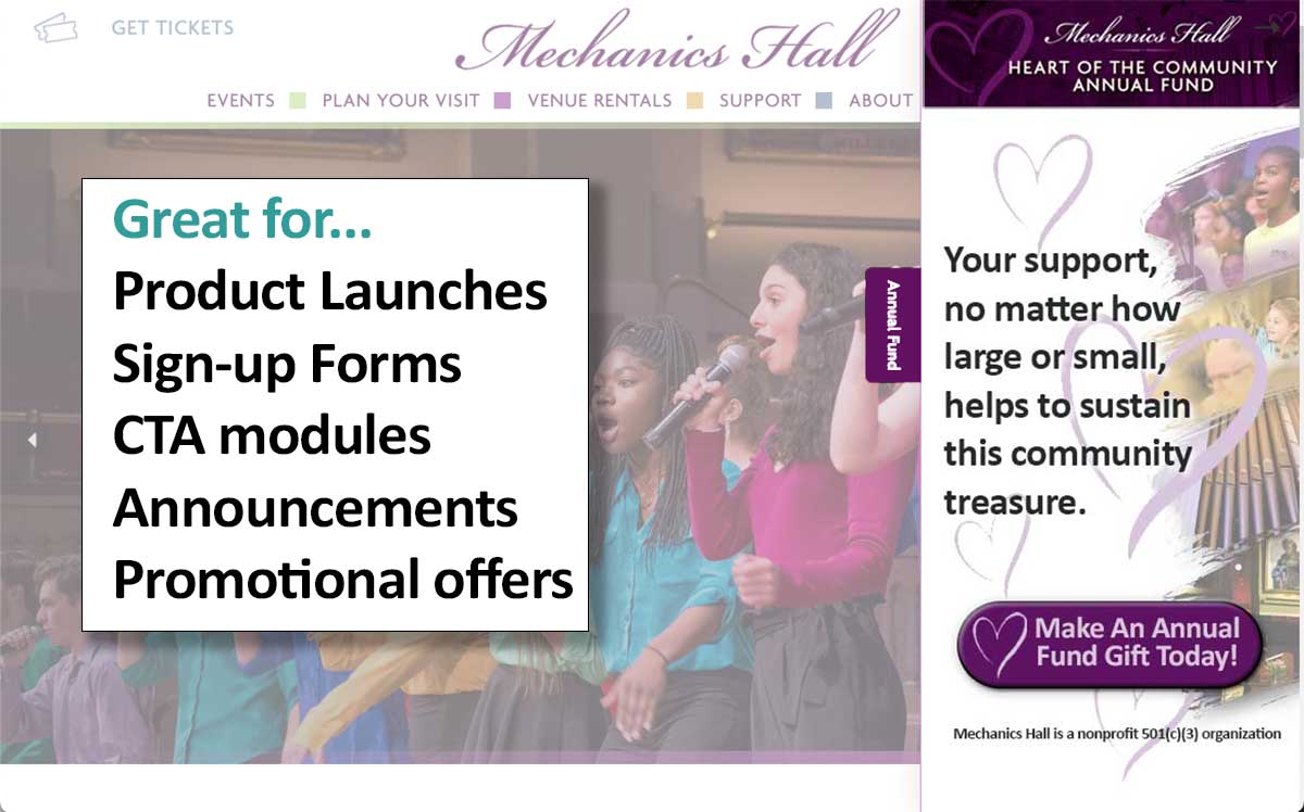 It’s perfect for when you want to give broad distribution to a single message without interfering with the rest of the page.