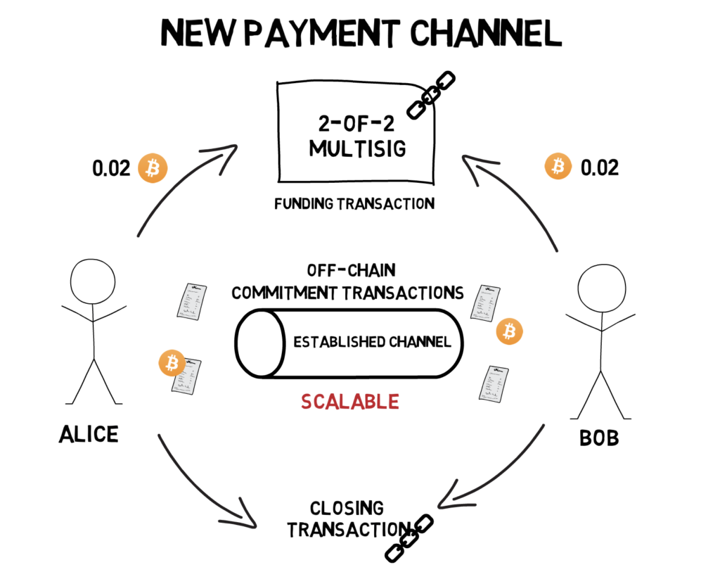 In order to open a new payment channel, two parties – Alice and Bob, have to commit funds to a 2-of-2