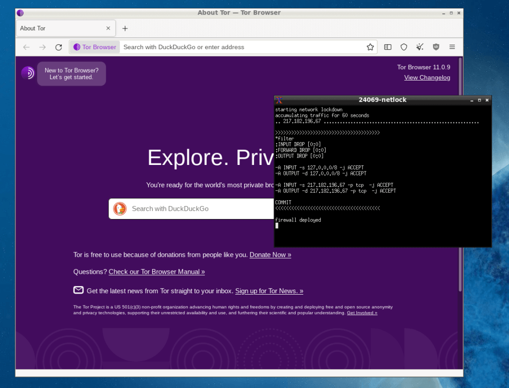 It also allows you to deploy a network firewall. Tor browser talks to the onion network using a very small number of IP addresses: a guard node, and one or two more guards in case the main one fails. Firejail detects these guards at startup, and builds and deploys the firewall. The firewall allows only the network traffic going to/coming from these guard nodes. De-anonymizing users by sending traffic outside Tor network is not possible. Use –netlock option to enable this functionality.