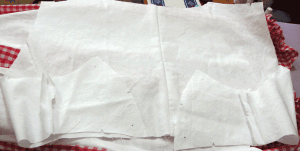 All the interfacing will be removed from this darted area and just left at the center front edges (about 4 inches) to keep those edges nice and sturdy for future buttons/snaps. By removing it, the darts and pockets should relax and hang straight.