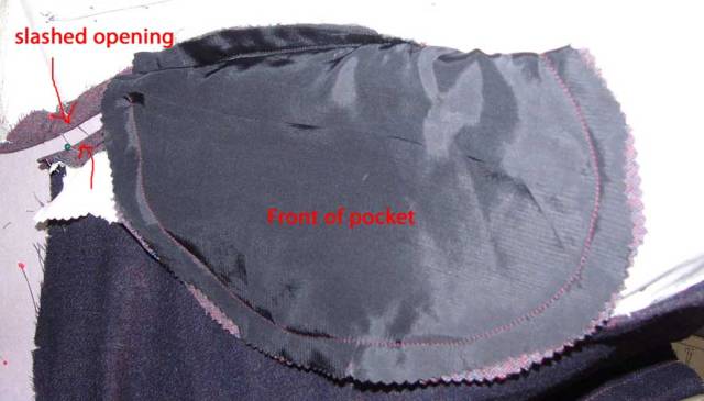 Well, well, well, after many hours of wondering what else I could do to make these pockets work, I removed all the pieces and decided to make the lining fabric sewn to the slashed opening instead of the wool. Then the wool section, not slashed, would then be attached to the lining pieces. Here is what it looked like but the pattern did not say how the front and back of the pocket would match to keep closed with showing raw edges as before.