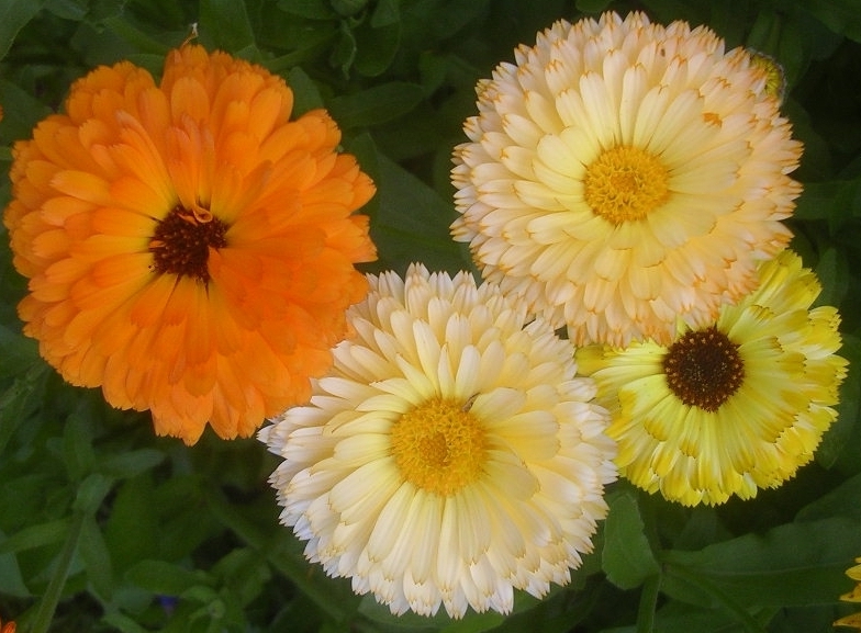 I’ve only dug up and brought home any English daisies I’ve grown in pots at home but I sowed some seeds which have just started appearing. The small plant I showed last month produced a couple more flowers but then died, I think due to my over watering it. A couple of weeks ago I dug up a couple more from one of the plot grass paths and they’re now in a 3.5 in/9 cm terracotta coloured plastic pot. There’s been a couple of flowers, and there are more buds showing.